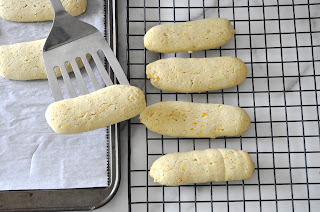 Pipe the dough on a cooking sheet covered with parchment paper. Make about 24 long strips of dough about 1 inch wide and 3.5 inch long.