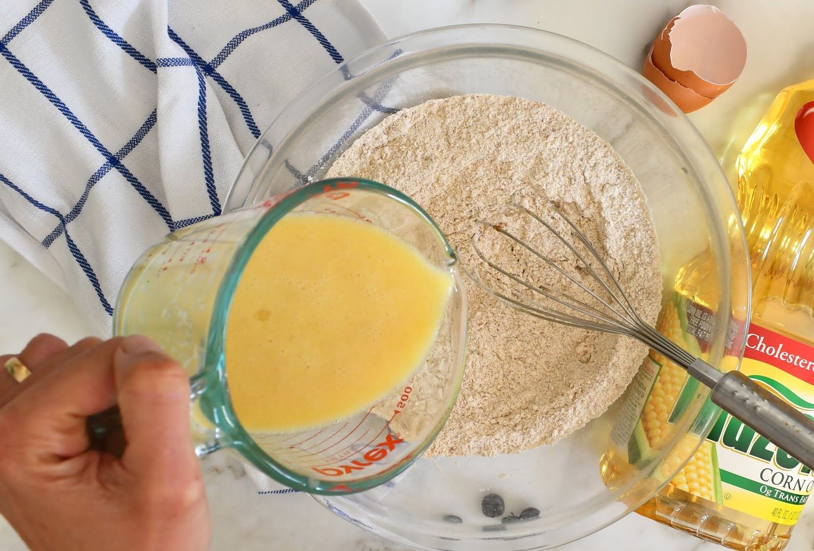 In today's recipe I substitute some of the all-purpose flour with white whole wheat flour, I use a smaller-than-usual amount of coconut sugar rather than regular sugar, I add some unsweetened applesauce to kick up the moisture level, and as I mentioned already, I swap out the butter and use corn oil.