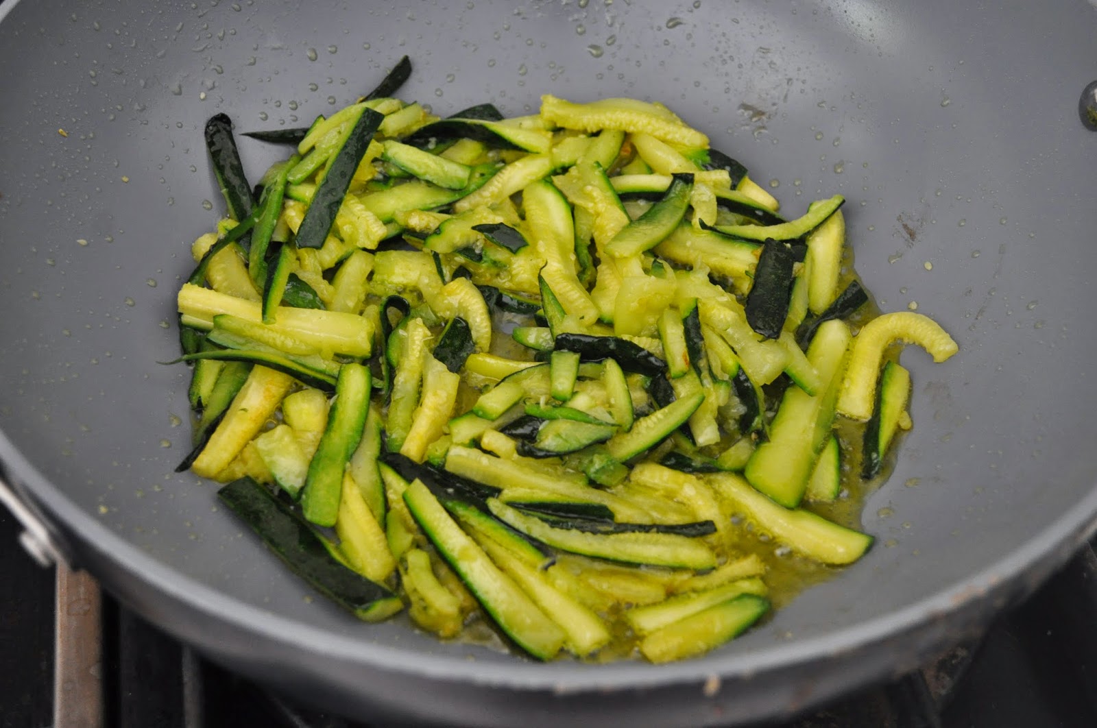 Step 2: In a large skillet, cook over medium-high heat the zucchini cut in long sticks with the olive oil. Salt to taste. After the first minute, cover the skillet and cook for about 5 minutes until done.