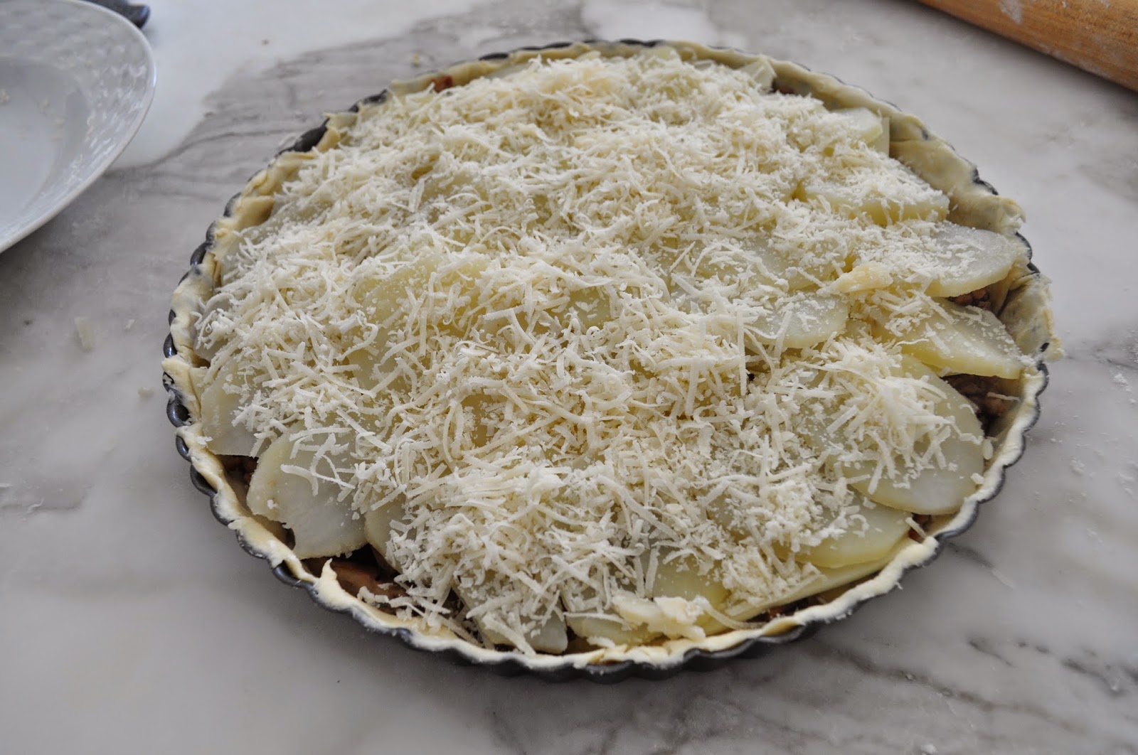 Savory tart with mushrooms, sausages, potatoes, and cheese.