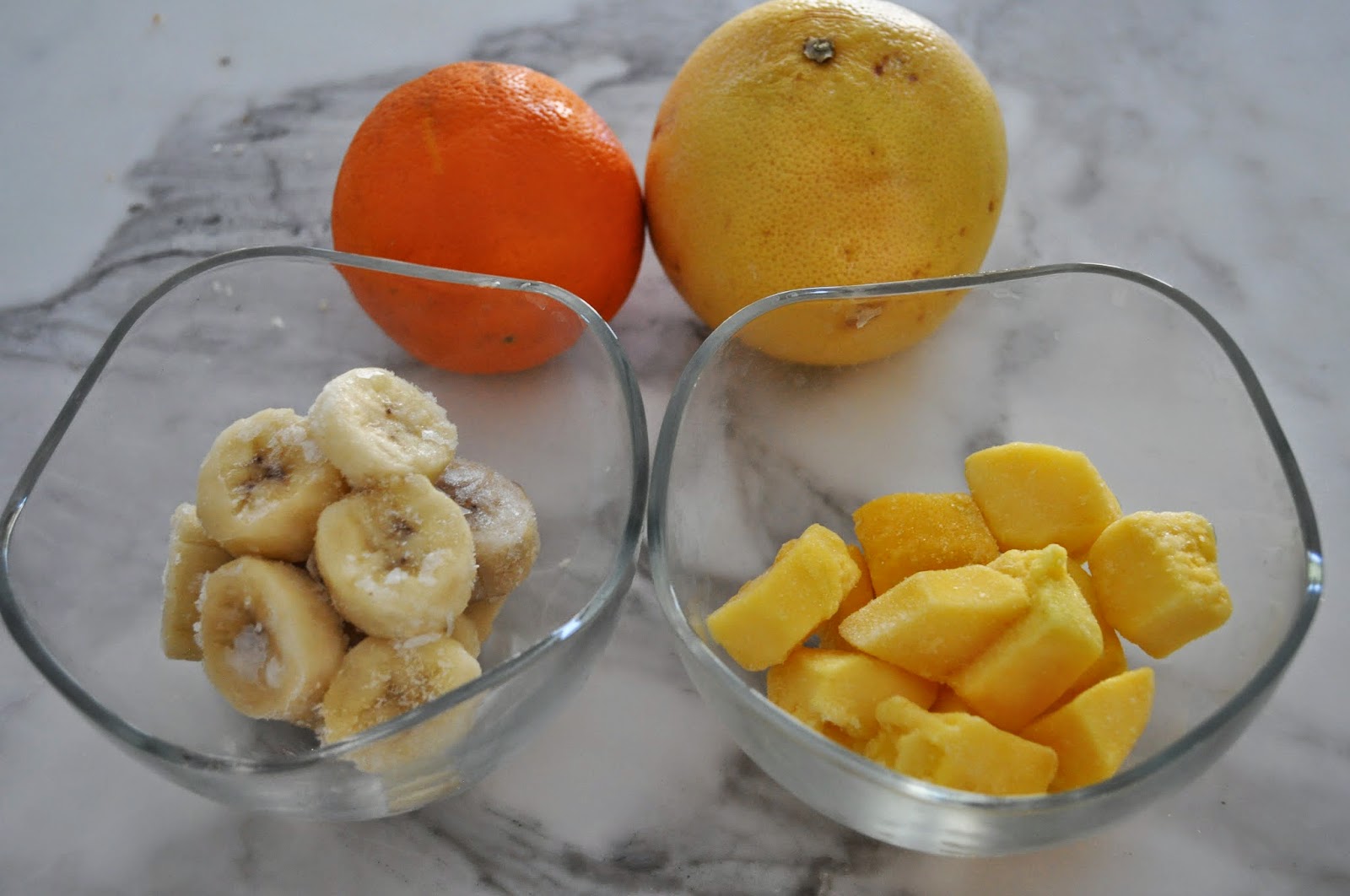 1. Cut the bananas and the mango in pieces. Place in a plastic bag and freeze, for 12 or more hours.