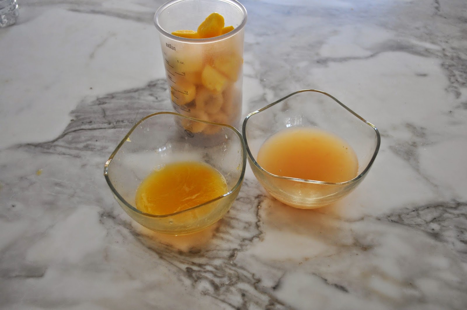 2. Combine the bananas, mango, orange juice, grapefruit juice and honey (if you are using it). Blend until smooth.