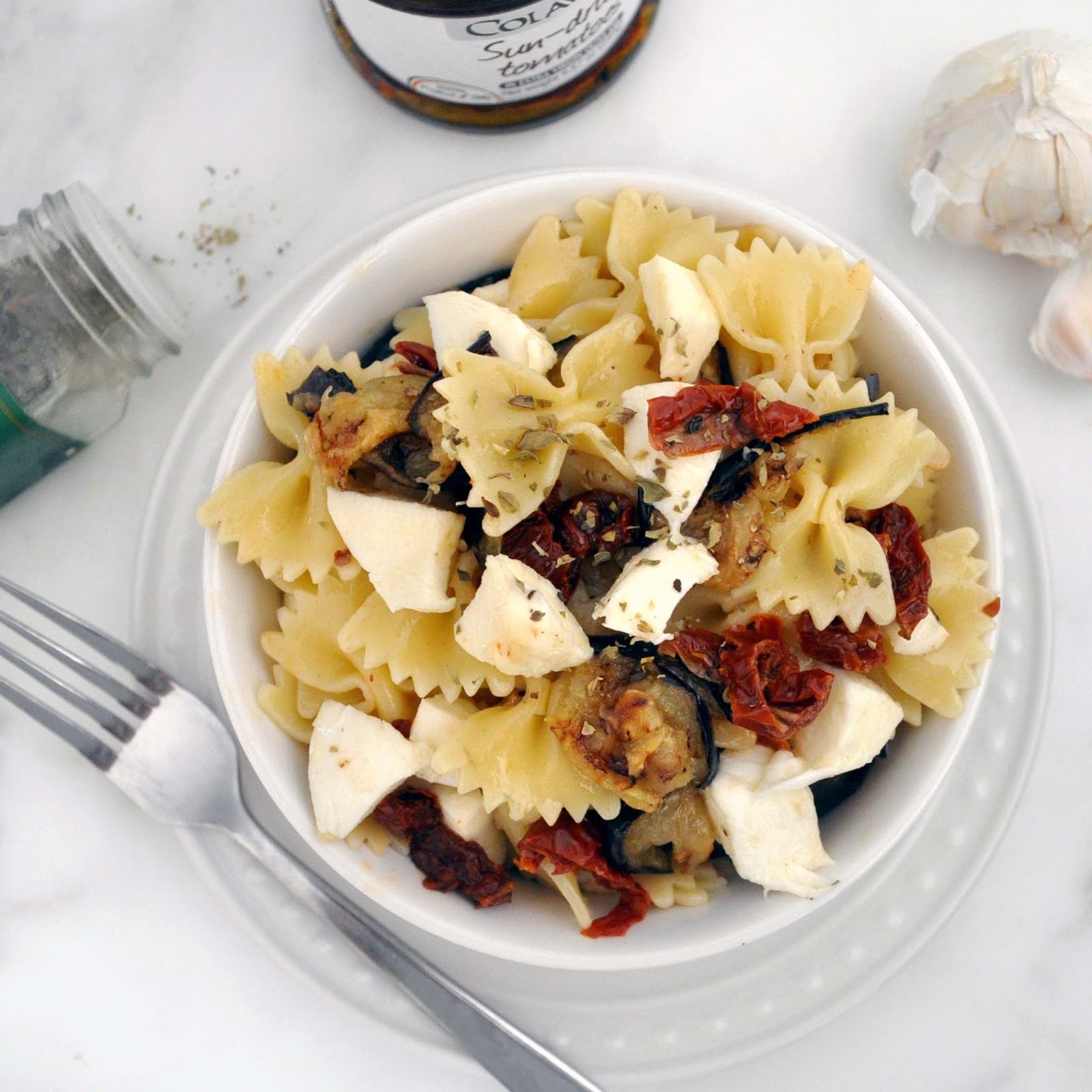 A fresh and healthy pasta salad with grilled eggplants, sun-dried tomatoes and fresh mozzarella